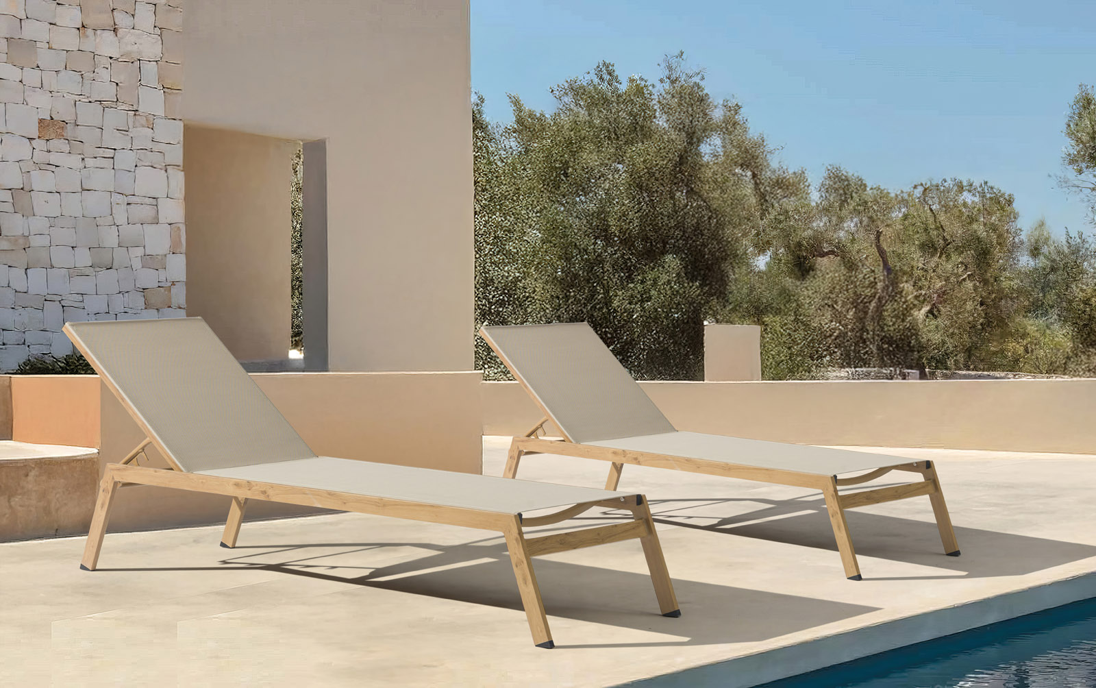 La Colección Java combina la resistencia del aluminio con un exclusivo acabado transferencia térmica efecto teca natural (WoodFeel by Mooma), logrando la calidez de la madera y la durabilidad del metal. Sus piezas se completan con generosos cojines —20 cm en asiento y 25 cm en respaldo— confeccionados en tejido in & out beige, suaves al tacto y resistentes en el exterior.