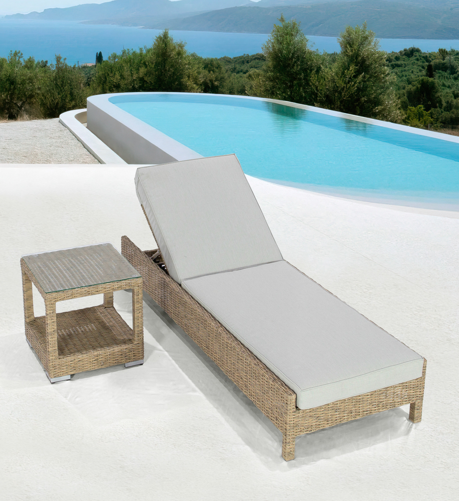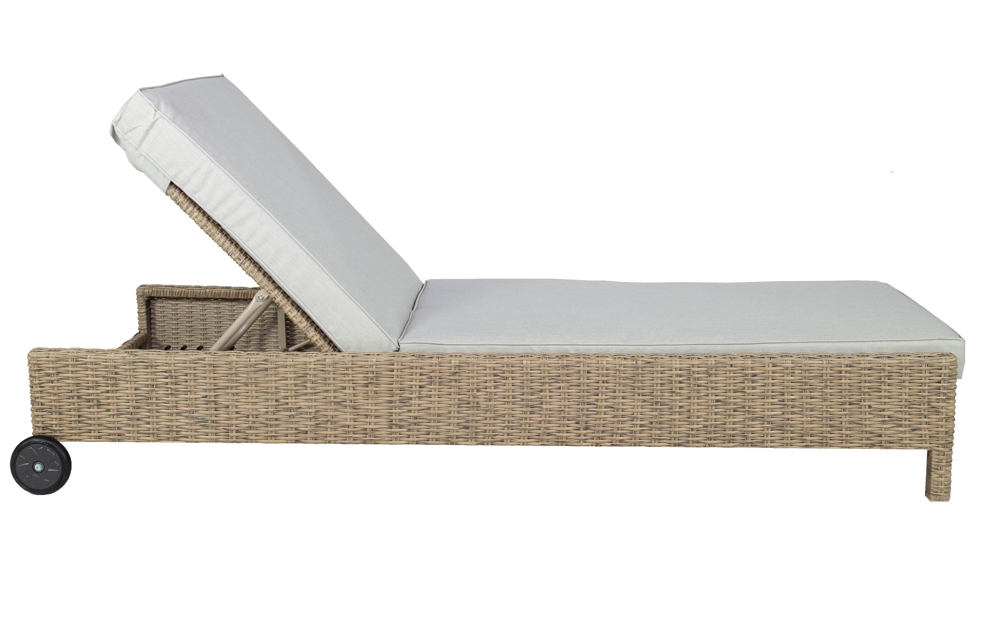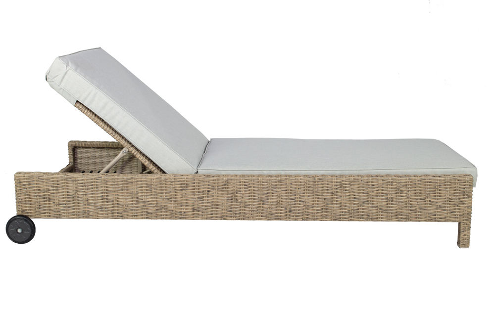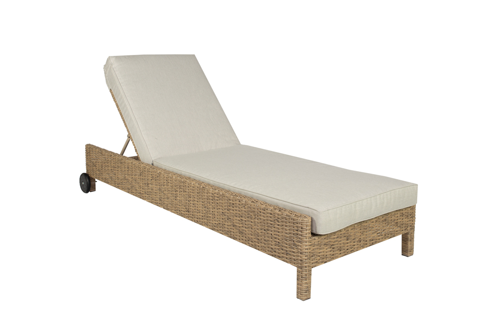 California sun lounger. Lacquered aluminium frame and half-round synthetic rattan, 5 mm diameter, natural effect, with 10 cm cushion. Multi-position backrest and transport wheels.