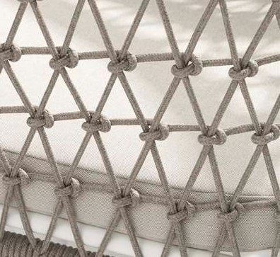 Chaise de salle à manger Nelayan. Structure en aluminium blanc combinée avec une corde grège de 6 mm. Coussin d'assise de 6 mm de couleur grège.