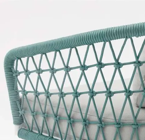 Chaise de salle à manger Nelayan. Structure en aluminium blanc combinée avec une corde aqua et un coussin d'assise de 6 mm de couleur gris clair.