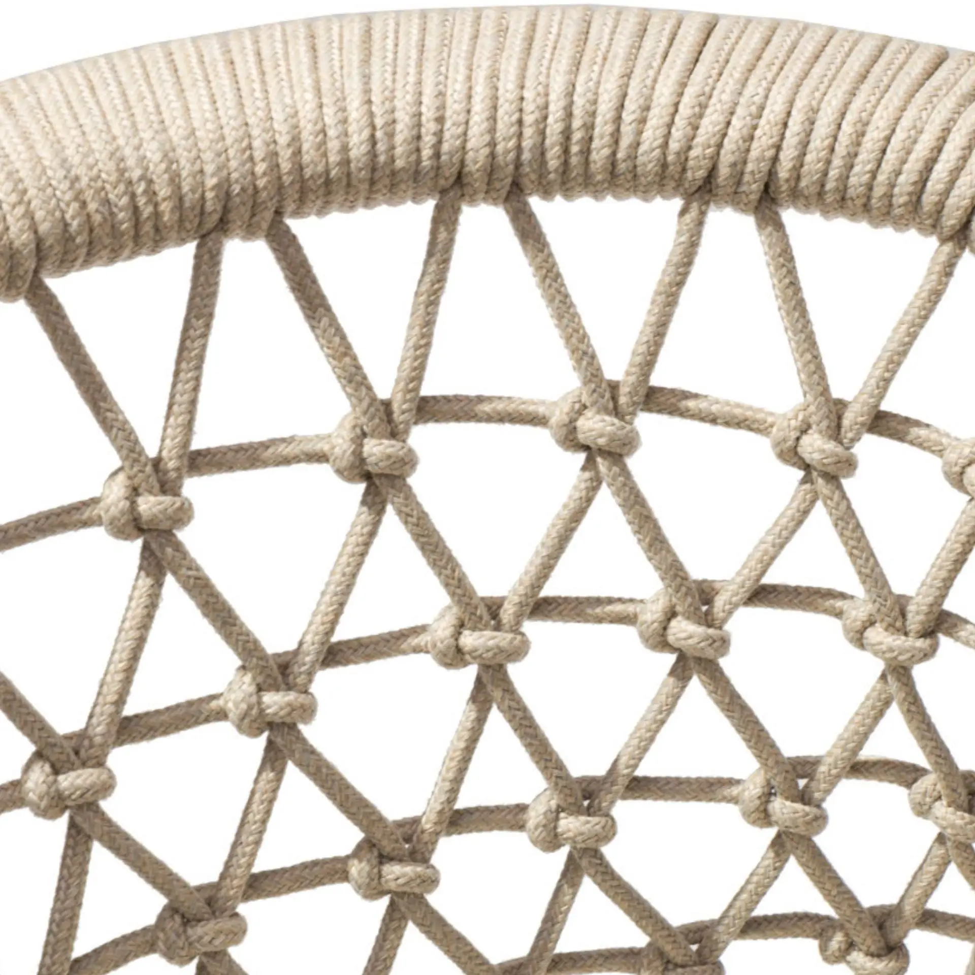Chaise de salle à manger Batu 56 x 62 x 74,5 cm (collection Java). Structure en aluminium recouverte d'un revêtement thermotransféré effet teck naturel combiné à une corde nautique couleur taupe. Coussin d'assise (4 cm) couleur beige.