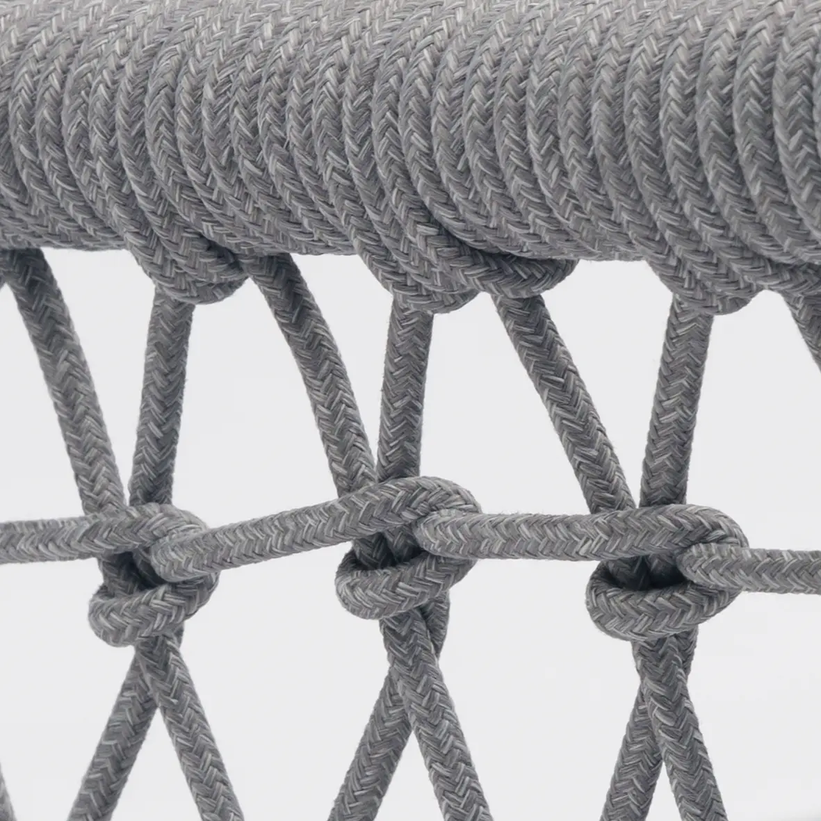 Sofá Isabela de 3 lugares. Estrutura em alumínio branco combinada com corda náutica cinzento-médio de 6 mm. Almofada do assento (12 cm) e almofada do encosto (15 cm) em tecido impermeável cinzento-claro.