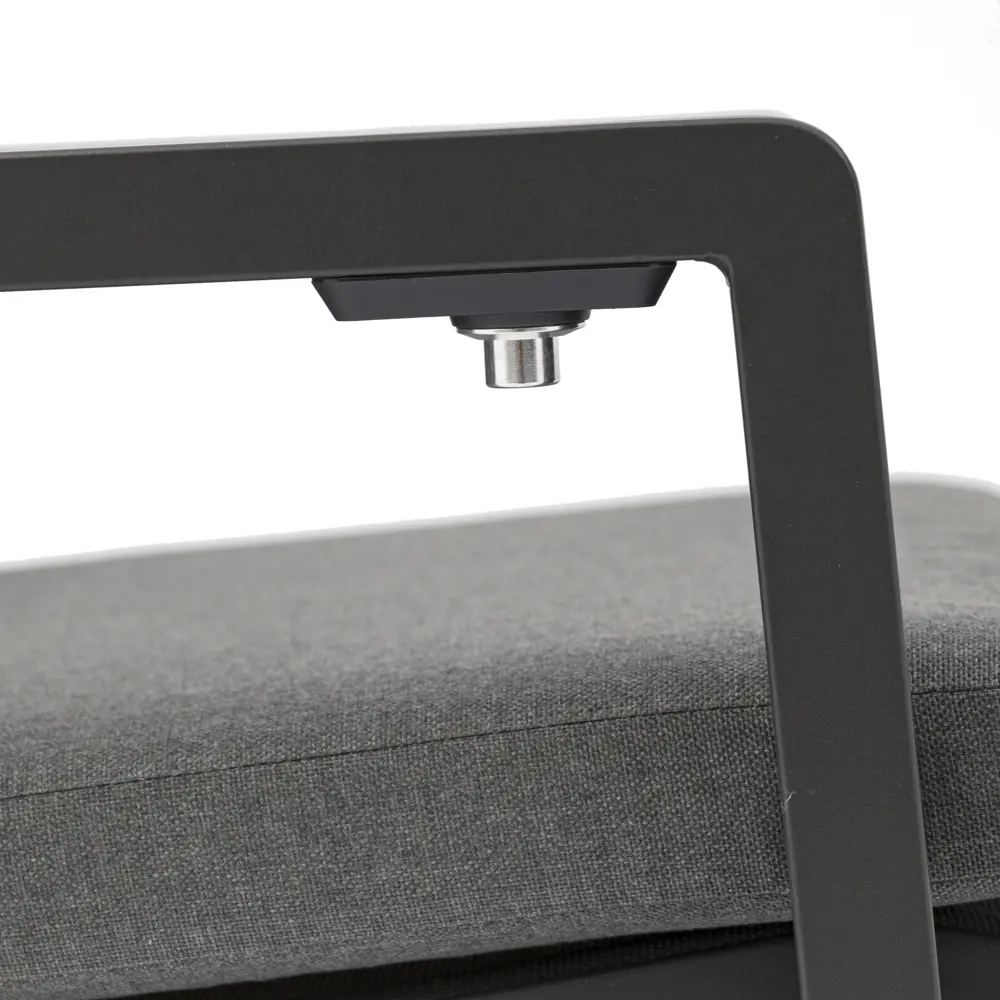 Sofá 3 plazas Albury. Estructura en aluminio antracita. Cojín de asiento (12 cm) y respaldo (8 cm)color gris medio. Respaldo de plazas laterales relax mediante bomba hidráulica.