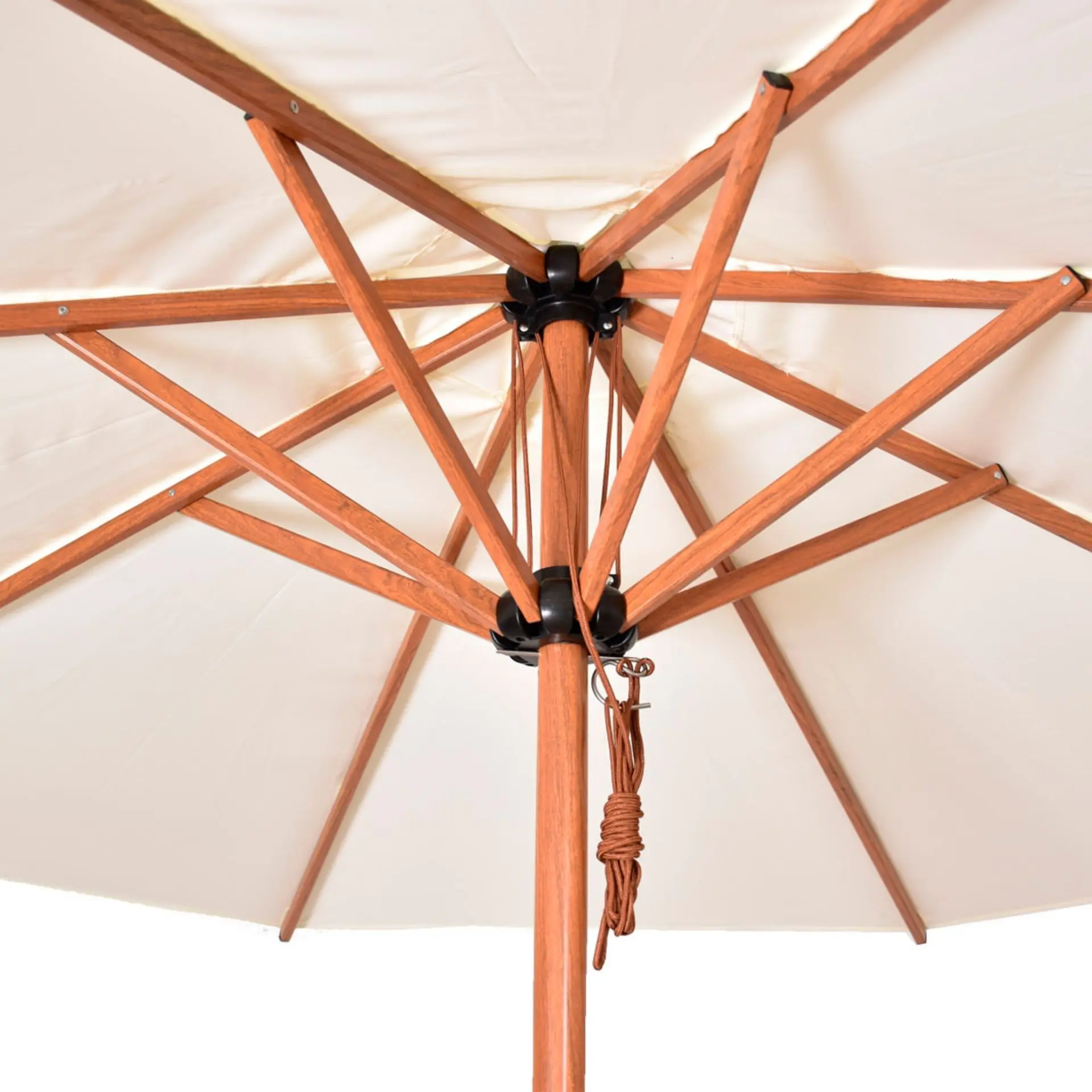 Sombrilla Igris octogonal Ø 300 cm. Estructura en aluminio recubierto por transferencia térmica efecto teca natural con mástil Ø 48mm. Cubierta color crudo 220g. Sistema de apertura por polea abierta y fijación superior por pasador.